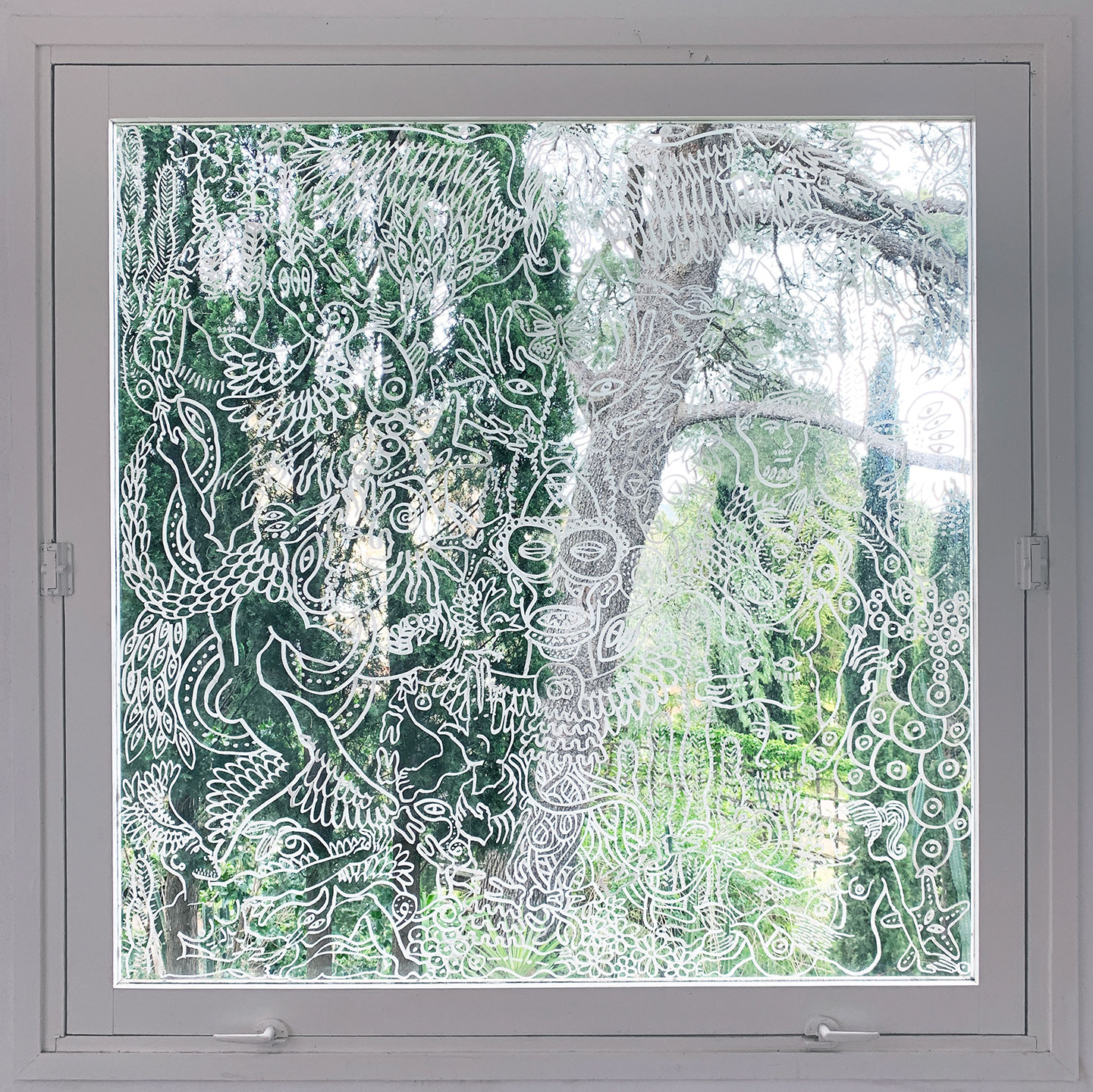 For the 34th International Festival of Fashion, Photography & Fashion Accessories in Hyéres France, I was asked by the creative director of the famous Villa Noailles, Jean-Pierre Blanc, to be a part of a special group exhibition of contemporary art focusing on queer male art entitled LOVE MY WAY and show my work alongside artists like Jean Cocteau, David Hockney, Slava Mogutin, Gio Black Peter and Pierre et Gilles. In addition, I was also invited to come to Hyéres and create a series of custom murals on mirrored walls and various windows of the Villa Romaine, a gorgeous and eccentric 19th century villa that was the hosting venue of the exhibition, and, perform live drawing and body-painting at the exhibition’s grand opening. Below are some images of the murals I made in the week leading up to the opening, and photos from my art performance.